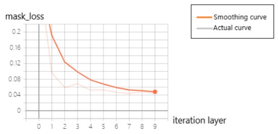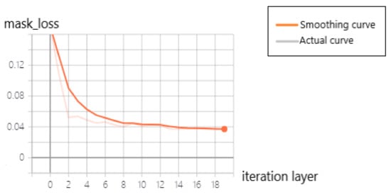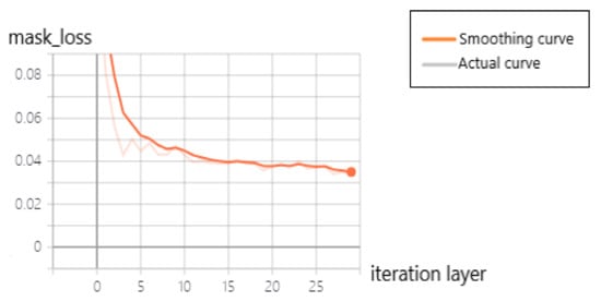 Finally, the relevant loss function values are recorded in Table 2. Observing Table 2, it is found that the classification loss function values and regression loss function values of Mask R-CNN match the curves in Figure 16, Figure 17, Figure 18, Figure 19, Figure 20 and Figure 21. The total loss function (loss) keeps decreasing as the number of iterative layers increases. The classification loss function (class loss) is combined with the regression loss function (bbox loss) and the mask loss function (mask loss) to ensure stable convergence of the model, so there are ups and downs, but the fluctuations are not large and the trend of decrease is maintained. The decline of the regression loss function (bbox loss), classification loss function (class loss), and mask loss function (mask loss) together constitute the convergence of the training model.