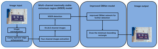 For street sign text detection in natural scenes, compared with existing methods, our proposed method was designed to eliminate the impact of complex backgrounds and illumination on detection, as well as the effects of different sizes and shapes of text regions in the images during detection. The detection process is shown in Figure 1. Although the text in natural scenes is greatly affected by the lighting and shooting angles, the pixel values and pixel relationships between text remain constant during character changes, so a multi-channel MSER method is proposed to preprocess the image. Compared with the traditional MSER method, the method in this paper uses multiple channels are used to extract the maximally stable extremal regions, reducing the impact of complex scenes and strong light on text area detection. In addition, an improved DBNet network is proposed to further detect the image of the text area preliminarily extracted by the multi-channel MSER method. Compared with the previous works, the newly added FPRE module and the HLFE module can make full use of the information of the feature extraction network, and improve the detection effect of the network on different shapes, sizes, and oblique texts.