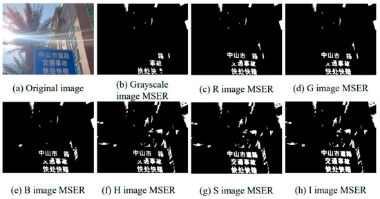 There are many color spaces for images, and the RGB color space is the most widely used color space. In addition, the HIS color space is often used in image processing. Therefore, in addition to selecting the most commonly used RGB color channel of the image, the experiment also studied the HIS. RGB and HIS color channel images are extracted, respectively, as shown in Figure 2. It can be found that the image in the S channel can effectively reduce the influence of strong light, and the text area is more obvious in the S color channel. The image under the H channel is greatly affected by the strong light, and the text area has been blended with the background under the influence of the strong light. The I-channel image can be replaced by different ratios of the R, G, and B channel information, as shown in (1). so the rendering effect of the image under the I channel is also similar to the effect of the RGB channel. Therefore, in the case where the maximally stable extremum region of the RGB three-channel has been extracted, it is of little significance to study the I-channel image. To explore the characteristics of the MSER method in different color channels, the Canny [27] operator was used to perform edge enhancement processing on the images of the RGB and HIS channels of the image, respectively, so that the text edges in the image become more obvious, thereby increasing the accuracy of the MSER algorithm, and then extracting the maximally stable extremum region from the image after edge enhancement, as shown in Figure 3. It can be found that the S channel can effectively extract the maximally stable extremum region under strong light, while the H channel is affected by strong light, and cannot effectively extract the maximally stable extremum region of text under strong light, and also introduces more non-text areas, which is not conducive to the further extraction of text areas using the deep learning framework. Therefore, it can be concluded that the S channel is very helpful for the initial extraction of the text area extracted by the MSER method, and the H and I channels are of little significance for the MSER method to extract the text area. Therefore, in the process of using the MSER method to extract the text area in multiple channels, we use R, G, B, and S color channels that contain important color information.