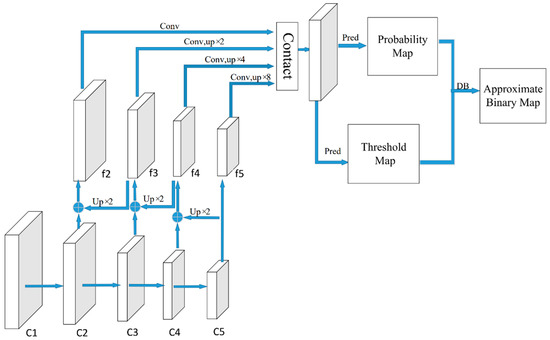 Although the multi-channel MSER model has removed most of the non-textual components of the image and reduced the complexity of the text detection problem, it is not sufficient to extract the textual regions of the street sign image, which motivated us to use an improved DBNet for further text detection. The DBNet algorithm is a segmentation-based network that can not only detect text in arbitrary directions but also use deformable convolution to enhance the detection of text with extreme aspect ratios. In addition, DBNet transforms the non-differentiable fixed binarization segmentation into an approximate differentiable binarization function, avoiding the problem of non-differentiable gradients, and it makes the final output image robust to the threshold value. While simplifying the post-processing, DBNet has better results on the lightweight backbone network, which accelerates the detection speed of the model. Therefore, we chose the DBNet model as the base network for street sign text detection in this paper, and the DBNet network structure is shown in Figure 4. However, the DBNet model adopts an FPN for feature fusion. When the FPN performs top-down feature fusion, the network expression ability is lost due to the mandatory reduction in feature channels, and there are missed and false detections for small-scale texts. In addition, the FPN is limited by the one-way information flow and the loss of low-level spatial information due to multiple sampling operations, which also have a certain impact on the accuracy of text detection.