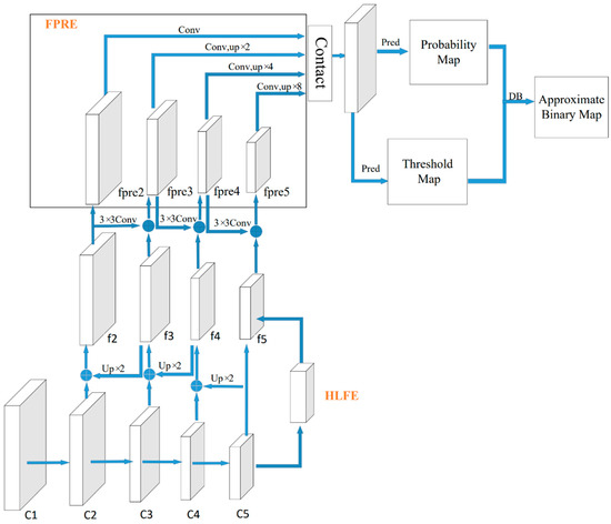 In this study, the Resnet-18 [28] lightweight network was selected as the backbone network for feature extraction, which effectively reduced the computational complexity of the model. In order to be able to cope with text instances with extreme aspect ratios, all 3 × 3 convolutional layers were replaced with deformable convolution layers in the conv3, conv4, and conv5 stages of the feature extraction network of Resnet-18 [29] to improve the network’s ability to focus on relevant image regions. At the same time, the HLFE and FPRE modules were introduced to enable the feature pyramid network of this model to fully utilize the high-level semantic information and contextual semantic information of the network. The structure diagram of the improved DBNet network is shown in Figure 5.
