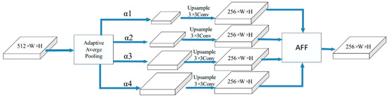 After downsampling, the channels of these four feature maps were changed to 256 dimensions through 1 × 1 convolutions, and the four feature maps were, respectively, normalized to a uniform scale by upsampling through 3 × 3 depthwise separable convolution and linear interpolation upsampling methods. Then, the four feature maps were fused into a feature map of the same size as f5 through adaptive feature fusion (AFF), and finally, feature fusion was performed with f5.