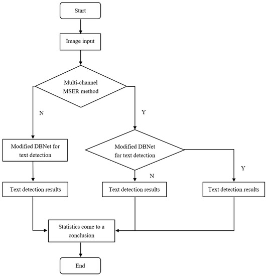 Through observation, it was found that although the shape of the text changed due to inclination and bending, the relationship between the pixel values of the same text region did not change. We used the maximally stable extremum region (MSER) [9] method to pre-process the image, classify the text region and non-text region of the image, and remove a large number of non-text regions, thereby reducing the impact of the complex background on the detection of this text region. On this basis, a differentiable binarization network [10] (DBNet) was used as the base network. Its feature pyramid component was improved to make full use of the high-level semantic information of the feature extraction network and the contextual information in the network to enhance the capability of the DBNet for image feature extraction based on the feature that the DBNet can set the binarization threshold adaptively and simplify the post-processing. Finally, the text regions classified by the MSER method were put into the improved DBNet network for further detection.