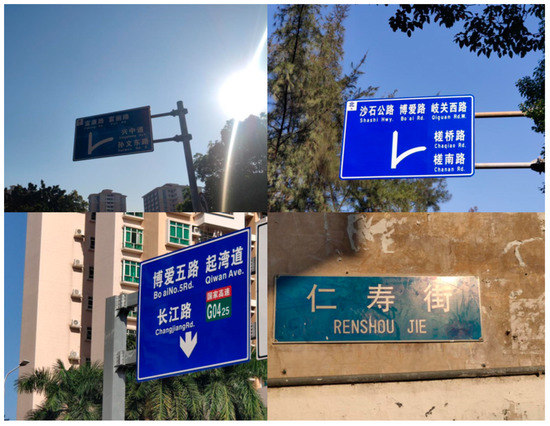 According to the literature survey, so far, no street sign dataset can be used in the natural scene of the experiment. Having a good dataset is the first step for street sign text detection experiments, so in this paper, we created our dataset, NSSS, to validate our proposed method. All of the datasets came from images taken in real environments, including street signs on both sides of daily streets, street signs in schools and shopping malls, street signs in scenic parks, and many other scenes, some data set images are shown in Figure 8. In order to simulate the noise that might be introduced by lighting and weather in natural scenes, some images were randomly adjusted the brightness and contrast. To obtain the true text areas (ground truth) of the images, all the images were manually annotated with text and 2000 images were selected from them for the experiment, of which 1500 were used for the training set and 500 were used for the test set.
