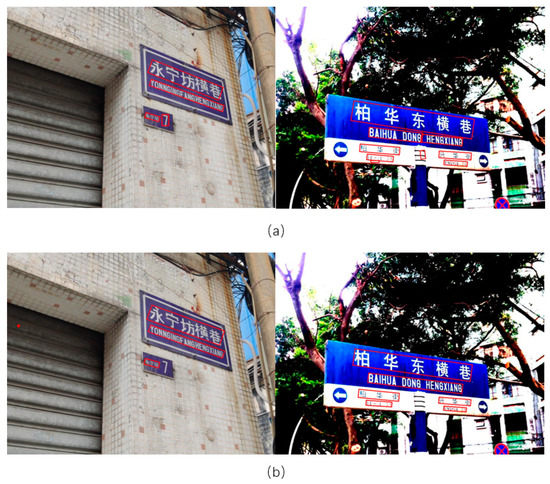 Comparison of visualization results of the method proposed in this paper and original DBNet model on natural scene street sign (NSSS) dataset: (a) is the result of the proposed method in this paper, and (b) is the result of the original DBNet model.