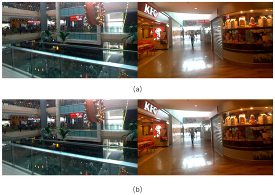 As shown in Table 2, when the HLFE module was added, the high-level semantic information of the network was fully utilized, thereby reducing the phenomenon of missed detection of small-scale text instances and false detection caused by the influence of non-text regions in the model. Therefore, the recall and accuracy were improved to a certain extent. When the FPRE module was added, the low-level semantic information of the network could be better propagated and utilized so that the model could better locate the text location and text boundary, improving the accuracy of the model significantly. When the HLFE and FRPE modules were applied together, the feature extraction effect was further improved. When the detection was performed after processing the image using the multi-channel MSER, the model’s recall was improved more significantly because a large number of non-text regions were filtered out, which effectively reduced the influence of non-text regions on the text regions and made the text features more evident, indicating the significance of the MSER method for image pre-processing. The final precision of the model was improved from 91.8% to 92.5%, the recall rate was improved from 82.1% to 86.8%, and the F-Score was improved from 86.7% to 89.5%. As shown in Figure 9, the proposed method in this paper had a better detection effect for regions with inconspicuous text features, and it worked better than the original DBNet model in terms of recall, precision, and F-Score.
