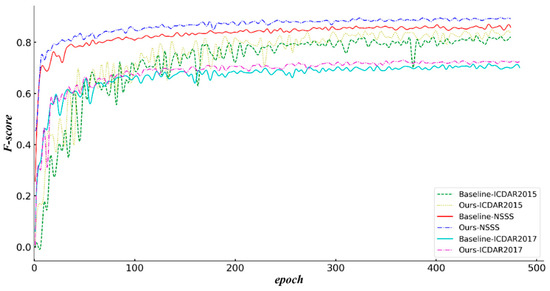 As shown in Figure 12, the method proposed in this paper showed better performances than the Baseline on both the ICDAR2015, ICDAR2017-MLT, and NSSS datasets in that the trained F-score tended to be stable with the increase in the number of training epochs. The yellow and green curves represent the F-score curves of our proposed method and the Baseline of the ICDAR2015 dataset, the purple and cyan curves represent the F-score curves of the method proposed in this paper and the Baseline of the ICDAR2015 dataset, respectively, and the blue and red curves represent the F-score curves of our proposed method and the Baseline on the NSSS dataset, respectively.