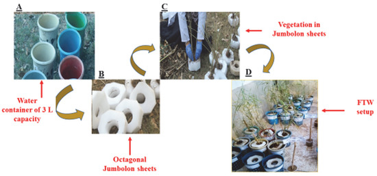 Development of floating treatment wetlands. Where, (A) shows the water containers, (B) shows octagonal jumbolon sheets, (C) shows the vegetation process, and (D) shows experimental setup.