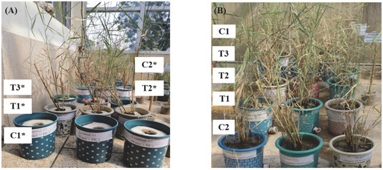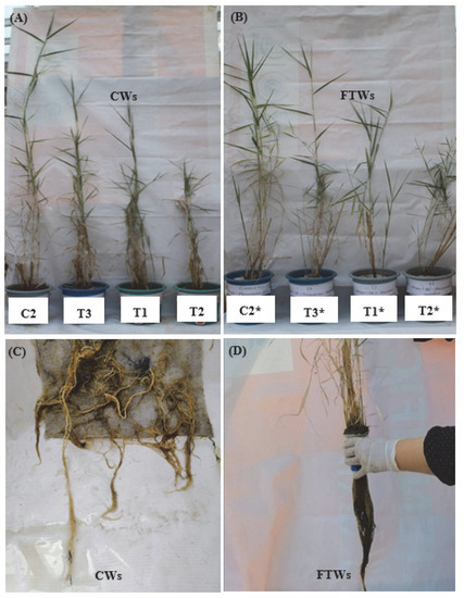 In this study, the plants vegetated in the bacterial-augmented wetlands (T3 and T3*) produced fresher and more dried biomass when compared with the plants vegetated in the treatments without a bacterial augmentation (T1 and T1*) (Table 3). This suggested that the bacteria possessed beneficial activities that might have helped the plants to grow well in the presence of contaminants. The plant growth-promoting activities of the microbes enabled the plants to amend their stress and improve their growth [26]. More shoot growth was observed in the CWs when compared with the FTWs; however, more root growth was observed in the FTWs compared with the CWs (Table 4 and Figure 8). More root growth in the FTWs might have been due to a space factor; in the FTWs, the roots had more space to grow compared with the CWs.