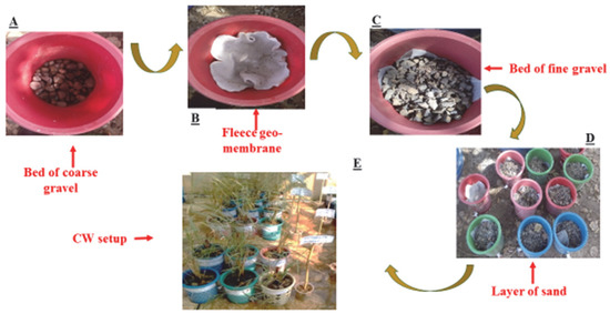 Development of constructed wetlands. Where, (A) shows the bed of coarse gravel, (B) shows fleece membrane, (C) shows bed of fine grave, (D) shows layer of sand, and (E) shows experimental setup.