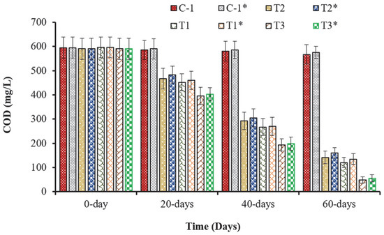 In this study, the bacterial species inoculated in the FTWs and CWs possessed the genes responsible for hydrocarbon degradation and PGP activities, which helped the plants to improve their growth in the presence of contaminants [26]. The decrease in the COD and BOD could be associated with enzymatic activities of the bacteria that take part in the breakdown and transformation of organics into simpler substances that are used by the plants as nutrients [39]. Both parameters are vital water quality indicators, and their decline is an indication of the cleaning of contaminated water. Lastly, the gravel and sand in the CWs also acted as a filter and reduced the pollutants from the water through absorption and adsorption [28,40,41], which might also have contributed to the treatment process.