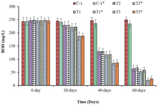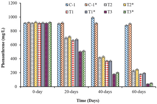 The comparative efficiency of the FTWs and CWs for the biotreatment of phenanthrene-contaminated water was assessed by analyzing the treated water for different physicochemical parameters. There was a significantly higher reduction in the COD, BOD, and phenanthrene concentration in the water treated by the FTWs and CWs when compared with the controls (C1 and C1*) (Figure 5, Figure 6 and Figure 7). There was an 81% reduction in the COD and a 78.5% reduction in the BOD of the water treated by the CWs (T1); there was a 79.7% reduction in the COD and a 76% reduction in the BOD of the water treated by the FTWs (T1*). The treatments that contained only bacterial strains (T2 and T2*) also showed a higher reduction in the water quality parameters (COD and BOD) when compared with the controls (C1 and C1*), but their efficiency was lower than that observed in the water treated by FTWs and CWs augmented with the bacterial consortium. The performance of the CWs was greater (non-significant) than the FTWs in the occurrence and absence of bacterial augmentations. In this study, the decrease in the BOD, COD, and phenanthrene concentration in the water treated by CWs (T1 and T3) was greater (non-significant) than that of the water treated by the FTWs (T1* and T3*). Approximately, a 92% reduction in the COD, an 89% reduction in the BOD, and a 93% reduction in the phenanthrene concentration were observed in the CWs augmented with the bacterial strains (T3); similarly, a 91% reduction in the COD, an 88% reduction in the BOD, and a 92% reduction in the phenanthrene concentration were observed in the FTWs augmented with the bacterial strains (T3*) (Figure 6 and Figure 7). In an earlier study, a 99.9% removal of phenanthrene was observed in water treated by a vertical-flow CW [10]. In another study, a comparatively smaller (85.5%) removal of phenanthrene was observed in CWs than was observed in this study [31]. Similarly, in another study, a comparatively smaller (79.91%) removal of phenanthrene was observed [32] than was obtained in this study. Usually, plants possess natural mechanisms to detoxify pollutants present in their surrounding environment [4,7,20,27,28,33,34]. Plants degrade complex organic compounds by processes known as phytodegradation [3,35,36,37]. This could be the basis that even the unaided vegetation considerably reduced the phenanthrene concentration and other pollution parameters in the polluted water. Phragmites australis allowed the bacterial strains to proliferate in the endo- and rhizosphere, which generally upsurged the plant health and treatment proficiency of the wetland systems [38].