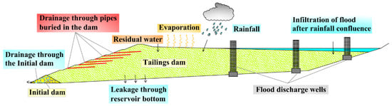When analyzing the seepage field of dry-stack tailings ponds, both water entering and drainage out of the seepage field should be firstly considered, as shown in the Figure 1. The main sources of water entering the seepage field include: residual water of tailings, rainfall, and infiltration of flood water after ponding in the dry beach. The drainage out of the seepage water mainly includes: the drainage through the initial dam, the drainage through drainage pipe buried in the dam, evaporation, and leakage through the pond bottom.