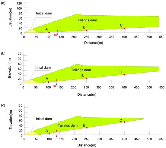 Model of dry-stack tailings pond: (a) i = sinβ = 0.05; (b) i = sinβ = 0.1; (c) i = sinβ = 0.15.