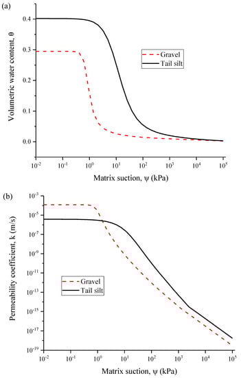There are many unsaturated parameter models of soil [16,19,30], the commonly used models include the Fredlund and Xing model [31], the Van Genuchten model [32,33], etc. The material of dry-stack tailings ponds is unclassified tailings, which is evenly distributed in the tailings pond and is considered as an isotropic material. In this study, the Fredlund and Xing model (Equations (12) and (13)) was used to describe the unsaturated soil properties of tailings. Since it is not for a certain tailings material, the saturated water content and saturated permeability coefficient of the materials can be taken according to experience. The other parameters in the Fredlund and Xing model of unsaturated soil were determined by the sample function method which was provided by the Geostudio platform. The gravel material was selected for the initial dam and the saturated water content was set as 0.295. The gravel sample function was used to fit the unsaturated soil–water characteristic curve. The tailings silt was selected for the accumulation dam, and the saturated water content was set as 0.402. The silt sample function was used to fit the soil–water characteristic curve of the tailings silt. The relationship between the permeability coefficient and the matrix suction was estimated by the Fredlund and Xing model. The saturated permeability coefficient of the gravel was set as 1.25 × 10−4 m/s, and the saturated permeability coefficient of the tailings silt was set as 3.75 × 10−6 m/s. The soil–water characteristic curve and hydraulic conductivity curve of the material are shown in Figure 3.