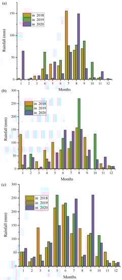 Annual rainfall distribution in different regions and years: (a) 400 mm: Taiyuan, in 2018, 2019, and 2020; (b) 800 mm: Zhengzhou, in 2018, 2019, and 2020; (c) 1200 mm: Guiyang, in 2018, 2019, and 2020.