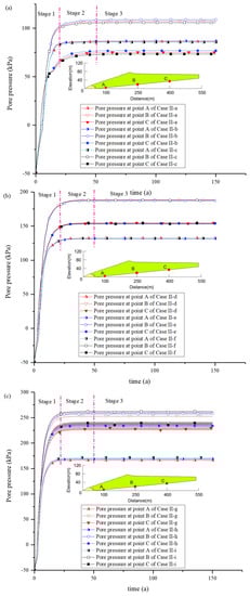 In this stage, the pore pressure of points A, B, and C remained basically stable but fluctuated within a certain range. Referring to Figure 5a, the point C in Case II-a has the largest fluctuation with 0.6 kPa, ranging from 74.6 kPa to 75.2 k, which is a small fluctuation range. Hence, it can be considered that the seepage field is in a relatively stable state. Referring to Figure 5b, the point C in Case II-f has the largest fluctuation with 1.3 kPa, ranging from 153.2 kPa to 154.5 kPa. Compared with the pore water pressure value, the fluctuation range is not large, therefore it can be considered that the seepage field is in a relatively stable state. Referring to Table 2 and Figure 5c, the fluctuation of point C in Case II-i is the largest, with it fluctuating between 235.8 and 241.8, and the fluctuation range is 6.0 kPa. Compared with the pore water pressure value, the fluctuation range is small. The main reason for the fluctuation lies in the influence of the rainfall curve within one year, that is, the greater the rainfall rate, the greater the fluctuation of the relatively stable seepage field. However, compared with the total pore pressure value, the fluctuation is not large, so it can be considered that the seepage field is in a relatively stable state.
