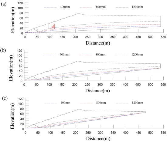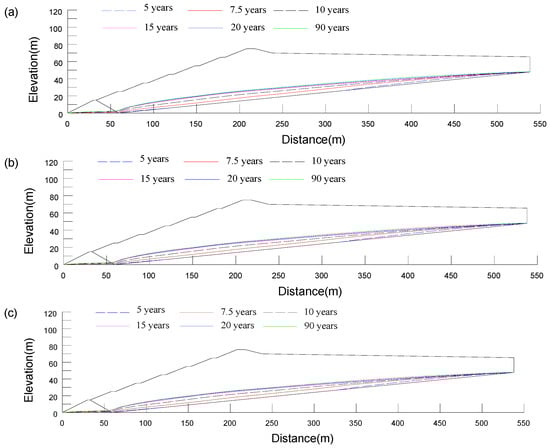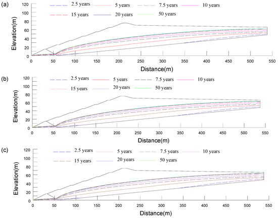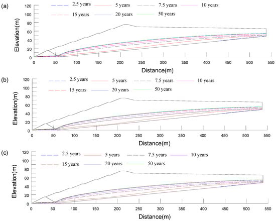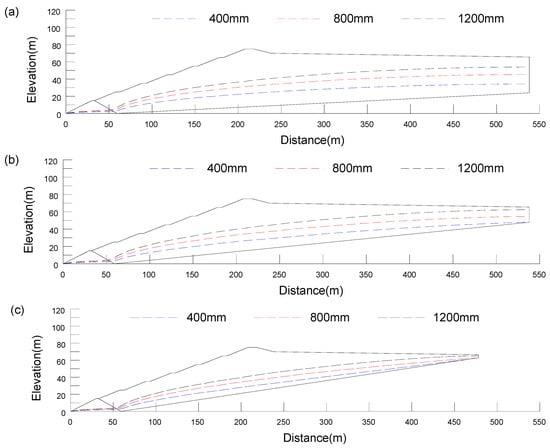 The spatial–temporal evolution law of the saturation line in the tailings pond (Zhengzhou, 800 mm): (a) Zhengzhou 2018 (caseII-d); (b) Zhengzhou 2019 (caseII-e); (c) Zhengzhou 2020 (caseII-f).