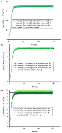 As can be seen from Figure 9a, the drainage flow of the initial dam grows with the increase in rainfall infiltration time. The drainage flow rate of the dam in the first 20 years is less than the average rainfall infiltration flow, which indicates that the water storage of the tailings in the dry-stack tailings pond is increasing, resulting in the continuous uplift of the saturation line in the dam. The larger the difference between the drainage flow and average rainfall infiltration flow, the faster the increase in the water storage in the dry-stack tailings pond and, furthermore, the faster the rise in the saturation line, which is consistent with the results about the evolution law of the saturation line in Figure 5, Figure 6 and Figure 7. Evidently, this reveals the reason for the rapid rise of the saturation line in the early stage of rainfall infiltration. With the time continuing, when the drainage flow of the initial dam is roughly equal to the average rainfall infiltration flow, the water storage in the tailings pond is no longer increased. Correspondingly, the saturation line is no longer uplifted, and the seepage field of the tailings pond is in a stable state. Due to the inhomogeneity of rainfall within a year, the seepage field of tailings pond will be in a fluctuating state, and its fluctuation characteristics are related to the rainfall curve. There are similar rules in Figure 9b,c.