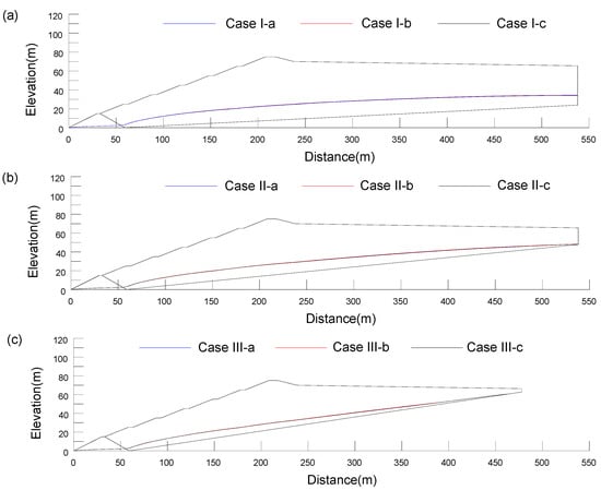 Distribution of the saturation line under different terrains of the tailings pond: (a) Taiyuan (annual rainfall of 400 mm); (b) Zhengzhou (annual rainfall of 800 mm); (c) Guiyang (annual rainfall of 1200 mm).
