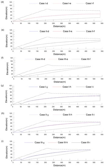 Saturation lines of the RSSF in the dry-stack tailings pond under different annual rainfall conditions are plotted in Figure 11. It can be seen from Figure 11 that under the same bottom slope conditions, annual rainfall has a great influence on the distribution of the saturation line. The greater the annual rainfall rate, the higher the position of the saturation line. Therefore, the seepage field distribution of the same dry-stack tailings pond differs with different annual rainfall areas, and the safety of the seepage field is also different.