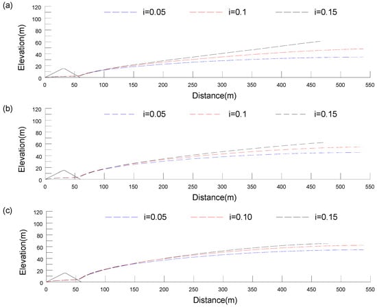 Saturation lines of RSSF in dry-stack tailings pond under different bottom slopes are plotted in Figure 12. It can be seen from Figure 12 that a RSSF can be formed under different bottom slopes, and the position of the saturation line increases with the increase in the bottom slope.