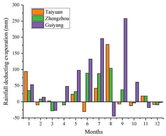 When the effect of evaporation is considered, the rainfall subtracting evaporation capacity is taken as the flow boundary in the calculation model. Figure 13 shows the D-value between annual rainfall and evaporation capacity in Taiyuan, Zhengzhou, and Guiyang in 2020. The relative stable seepage fields considering evaporation effect were calculated, as shown in Figure 14.
