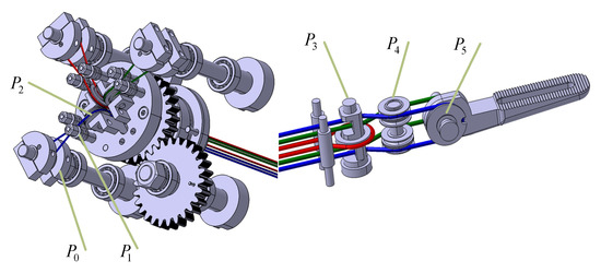 There are generally four degrees of freedom for surgical instruments in laparoscopic minimally invasive surgery robots, in which one is the rotation freedom of the operation rod, one is the rotation freedom of the wrist, and the other two degrees of freedom are the rotation freedom of the two graspers. The transmission structure of surgical instruments is shown in Figure 1, wherein, and are the driving pulley and driven pulley, respectively, and , , and are idler pulleys. The cables of surgical instruments consist of two parts: the non-contact segment and wrapped segment. The non-contact segment of the cable is relatively long, which plays a dominant role in the position transmission characteristics of the surgical instruments, while the wrapped cable segment plays a decisive role in the force transmission characteristics of surgical instruments.