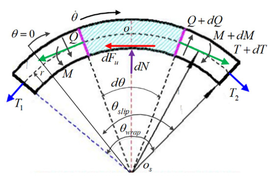 where and are, respectively, the cable radius, the pulley radius and the bending radius of the cable, and are the incoming tension and outcoming tension, and and are the slip angle and wrap angle, respectively.