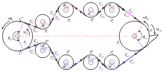 As shown in Figure 5, it is a closed-circuit cable-pulley system consisting of cable T, cable B and 10 pulleys. The radius of the cable is r, the friction coefficient of the cable moving along the pulleys is , and the pulley and are, respectively, the driving pulley and the driven pulley, whose radii are, respectively, and , the pulley rotates around its support rolling bearing, and the pulley , i = 1, 2, 3, 4 are the idler pulleys driven by the cable T, and their corresponding bending radius, sliding angle and wrap angle are, respectively, , and , the tension on both sides of the pulley are and , respectively, and the tangent length between the pulley and is ; the pulley , i = 1,2,3,4 are the idler pulleys driven by the cable B, their corresponding bending radius, sliding angle and package are , and , respectively, and the tension on both sides of the are and , respectively, and the tangent length between the pulley and is .