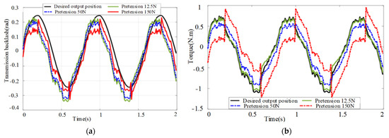 The displacement and torque transmission characteristics of cable-pulley systems exerting different pretensions: (a) Transmission backlash of the cable-pulley system exerting different pretensions; (b) Output torque of the cable-pulley system exerting different pretensions.