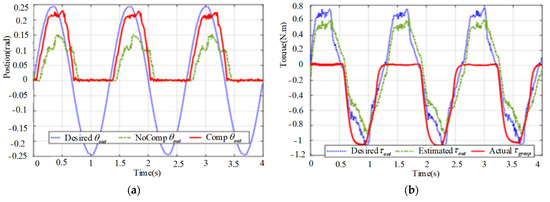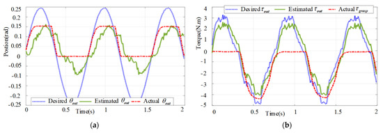 Comparison curves of the output displacement and grasping torque of distal graspers of the surgical instrument with transmission backlash compensation: (a) Comparison curve between the measured values and the desired values of the output displacement of the distal graspers; (b) Comparison curve between the estimated values and the desired values of the grasping torque of the distal graspers.