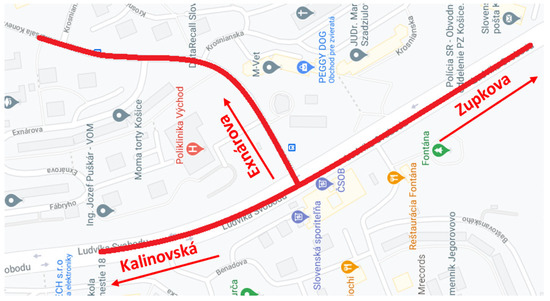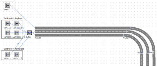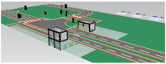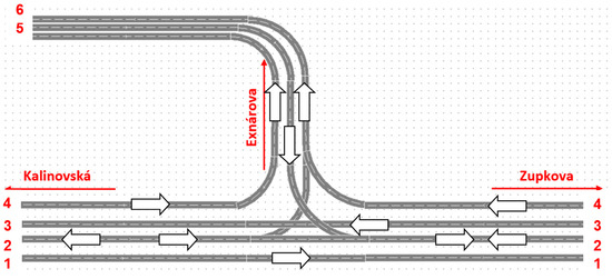 To verify a possibility of simulating and visualizing traffic processes by Tecnomatix Plant Simulation, a specific intersection was chosen in Figure 3. As part of methodology verification, the effort was to create the most genuine model of the transport node with the definition of all rules and control systems including transport telematics.