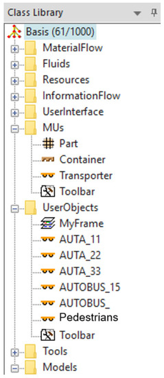 Program’s library serves as a file that groups information flows, material flows, resources, user interface, tools and, last but not least, user objects. It makes the programmer’s work easier by offering pre-defined attributes needed when creating a model. When creating the model, only the Transporter object was used (Figure 5). The object serves as a vehicle moving along designated routes. Six transporters were created, three of which, named AUTA_11, AUTA_22 and AUTA_33, represent passenger cars. The transporter AUTOBUS_15 is created for bus line 15. A denser interval is set for AUTOBUS_, as this transporter represents the remaining bus lines passing the intersection, i.e., line 17, 54, 55, 71, 72. The last transporter used in the model, Pedestrians, shows the pedestrians crossing the crossings and is graphically distinguished from passenger cars and buses.