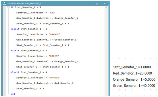 Another element from the library needed to create light signaling is the aforementioned Generator. It was renamed to Gen_Semafor_1, then set according to a color generation interval. Each semaphore has its own generator, which is subsequently referred to by a method–Method element. The method was named Met_Semafor_1 (Figure 8) and was also unique for each light signaling, defining the functionality of Semafor_1 attribute. This is where the principle—the brain of the entire light signaling—is embedded. It indicates that if the signaling status is equal to 1, the color of Semafor_1 should change to red. If its state is set to 2, it should change to orange, and when it is set to 3, to green. State 4 was added for a repeating cycle which includes orange color between the green and red signals. In this method, the Gen_Semafor_1 interval is included, followed by the next signal.
