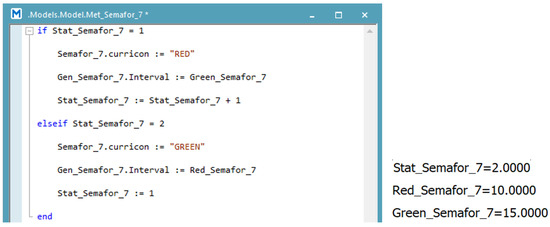 At the same time, it is possible to work with input information obtained from traffic surveys in the simulation model and define any light signaling system with the help of additional programming (Figure 18). Due to variability and additional programming, different results and analyzes can be obtained from the model, as the SimTalk allows programming a wide range of different analysis calculations and graphical displays.