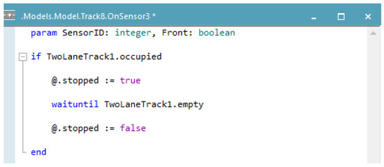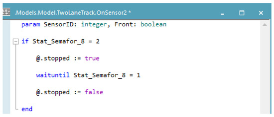 At this crossing crossed by a road, a conflict zone arises, which was resolved by one connector for stopping the vehicle if the STOP signal is present. Figure 10 shows a method of stopping and letting pedestrians go. It works on the same principle as the previous connector, i.e., if the status of variable Stat_Semafor_8 = 2, it stops pedestrians, and if the status of variable Stat_Semafor_8 = 1, it lets them go.