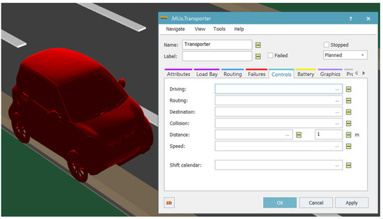 Tecnomatix Plant Simulation has tools that allow modeling different types of vehicles and their behavior, e.g., in the CFM model. It is, first of all, the MUs.Transporter (Figure 12). As can be seen, possibilities to define parameters and behavior of the transport means are wide. At the same time, the second tool that supports the CFM implementation is using the method of programming in the SimTalk language.