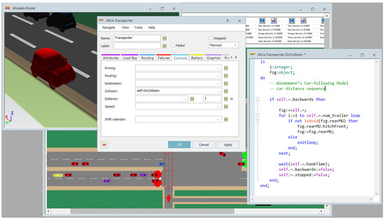In the program, such parameters can be considered as tracking the distance between vehicles and possibility of approaching and moving away from each other. Based on these facts, within the simulation model describing transport processes created in the Tecnomatix Plant Simulation program it is possible to implement suitable Microscopic simulation tools based on underlying microscopic models, e.g., Wiedemann’s Car-following Model (Figure 13).