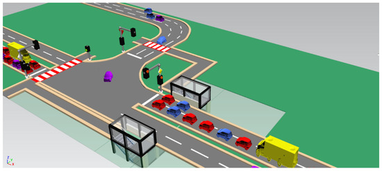 Presented results clearly demonstrate the accuracy of research hypothesis. Tecnomatix Plant Simulation, despite being not primarily intended as a simulation tool for modeling traffic processes in transport, allows us, with the use of available software tools and the proposed methodology, to create a full-featured, discrete microscopic traffic model of any traffic node. The proposed methodology was verified in the creation of a real traffic node simulation model. Due to additional programming, modeling of roads and transport infrastructure is enabled, including transport telematics. At the same time, it provides solid possibilities to visualize traffic processes in 2D (Figure 16) and 3D (Figure 17).