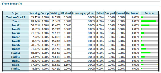 The Tecnomatix Plant Simulation offers and enables presentation of results of the same character. It enables monitoring characteristics of each vehicle that is on the road during the simulation experiment. It enables evaluating roads permeability with regard to their capacity. The listed outputs can be seen in Figure 20.
