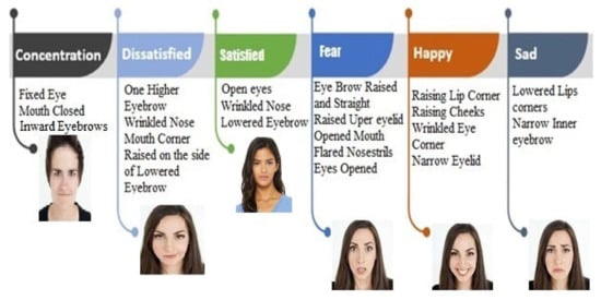 The selected emotional states are happiness, sadness, and fear along with the cognitive–emotional states of satisfaction, dissatisfaction, and concentration. These facial expressions are identified using Python APIs. Figure 2 explains the facial features selected to identify each facial expression.