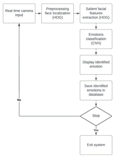 The proposed automatic facial expressions recognition system is installed in the classroom and a camera takes the face of the student as an input for the system. The camera and the system are set up to be ready before the beginning of each lecture. The system is capable of identifying the facial expressions of the students with the help of the facial expressions used to train the system. The system continuously saves the facial expressions of each student and the changes in facial expression during the lecture in a database. Figure 3 explains the automatic facial expression recognition system. While the proposed FER system is depicted in Figure 4.