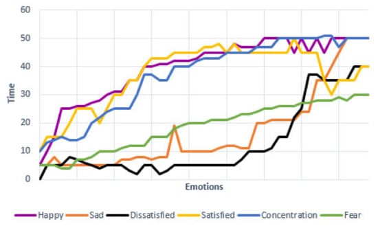 Moreover, the selected subjects with higher difficulty level were analyzed with the time duration of the lecture and the values indicate that the dissatisfied facial expression was found to be at its peak when the lecture duration was 15 min and was lower at 30 min and 45 min, as shown in Table 7.