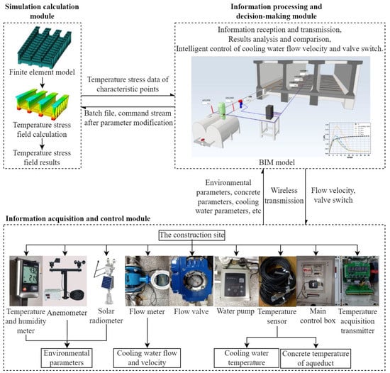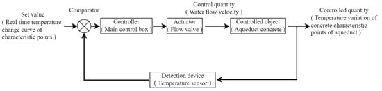 In the early stage of the project, the simulation calculation module is used to simulate and calculate the actual boundary conditions of the project, concrete parameters and the temperature stress field of the aqueduct concrete under different water-cooling conditions. The temperature changes of the concrete at the characteristic point obtained under the working conditions where the stress value of the characteristic point is close to the design value of the tensile strength is taken as the initial temperature variation control curve and stored in the information processing and decision-making module to provide a reference for the intelligent regulation of the water flow rate; At the construction site, the temperature instrument records the machine inlet temperature, warehousing temperature and pouring temperature in real time and automatically transmits them to the information processing and decision-making module, providing necessary data preparation for temperature control effect evaluation, early warning and forecasting and intelligent regulation. During the construction process, the temperature sensor is fixed at the corresponding position of the concrete. The temperature and humidity meter, solar radiation meter, anemometer, flow meter and temperature sensor are used to monitor the temperature and humidity, solar radiation, wind speed, water flow rate, water temperature and other information on the surface of the pouring bin. Data are transmitted to the information processing and decision-making module for storage and management in real time through the signal transmission line and signal acquisition transmitter. The information processing and decision-making module determines the flow rate of cooling water and the valve switch according to the measured temperature variation and temperature variation control curve of concrete characteristic points. The simulation calculation module simulates and calculates the temperature stress field of the aqueduct based on the real boundary conditions and the adjusted cooling water parameters and then transmits back to the information processing and decision module the temperature stress data at the characteristic points. The total control box in the information collection and regulation module receives the regulation instructions from the information processing and decision-making modules, controls the water flow rate and water valve of the water pipe through the connected water pump and solenoid valve and realizes the ideal temperature control of the concrete. The system architecture is shown in Figure 1, and the closed-loop control block diagram is shown in Figure 2.