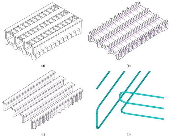 Layout simulation diagram of cooling water pipes poured by stages in an aqueduct. (a) Overall model of aqueduct (b) The first stage of concrete pouring water pipe arrangement (c) The second stage of concrete pouring water pipe arrangement (d) water pipe simulation element.