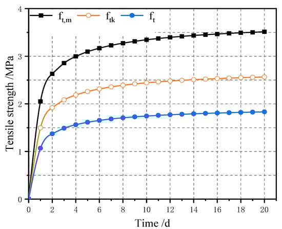 C50 concrete has the highest strength among ordinary strength concrete, and its material properties such as strength and modulus of elasticity change with time in a significantly different way from other ordinary strength concrete, which is essential for the control of temperature stress in the structure of the aqueduct during the construction period. Equation (4) is an expression for the variation of the cube compressive strength of C50 concrete with time fitted by Zhao [13] based on experimental data. The mean, standard and design values of the axial tensile strength of concrete were obtained sequentially according to the cube compressive strength [14,15,16], as shown in Figure 4.