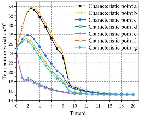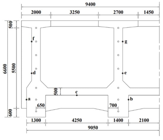 In order to prevent the occurrence of cracks affecting structural safety and to characterize the temperature stress field of concrete for the aqueduct, the characteristics of seven locations (a–g) on the mid-span section of the aqueduct are taken as the characteristics, taking into account the symmetry of the aqueduct structure, the temperature stress and the comprehensive influence of concrete gravity, as shown in Figure 5.