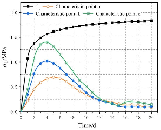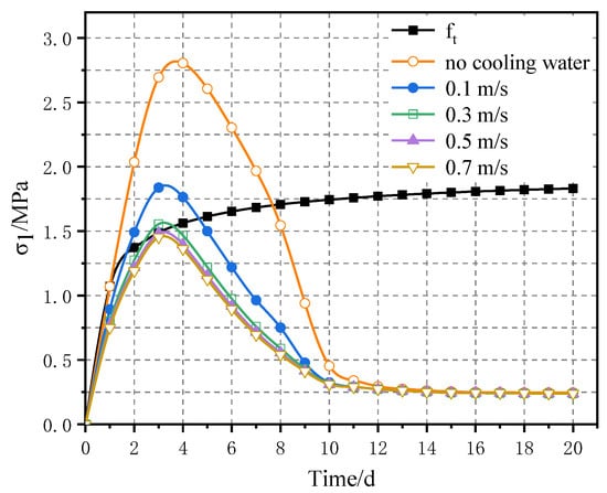 According to the expected pouring time of the actual project, the concrete pouring temperature of the aqueduct was temporarily set at 25 °C. The cooling water temperature and boundary temperature were 15.2 °C, the average temperature in March. Under the same working conditions, the stress at the characteristic point c is greater than that at other characteristic points. The simulations calculate the stress values of the characteristic point c at the combination surface of new and old concrete when no water or water flow rate at 0.1 m/s, 0.3 m/s, 0.5 m/s and 0.7 m/s are shown in Figure 6, respectively.