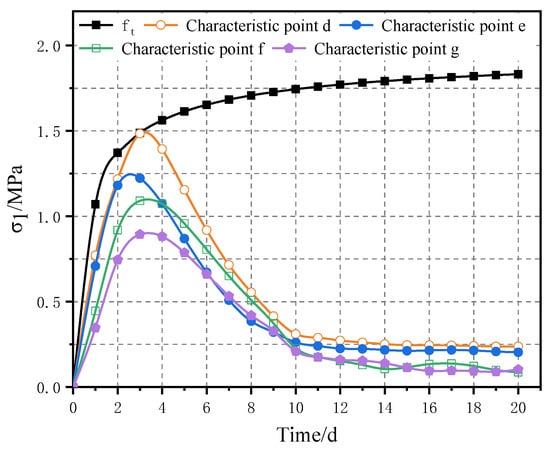 In various working conditions, when the cooling water flow rate is greater or equal to 0.5 m/s, the stress value of characteristic point d will be less than the design value of the real-time tensile strength of C50 concrete. Figure 7 and Figure 8 show the stress duration curves of each characteristic point when the cooling water flow rate is 0.5 m/s. On the third day after placing the second layer concrete of the aqueduct, the tensile stress value of characteristic point C reaches 1.48 MPa, while the design value of the tensile strength of C50 concrete is 1.49 MPa. Figure 9 shows each characteristic point of the temperature variation curve for the initial temperature variation control curve at the cooling water flow rate of 0.5 m/s working conditions.